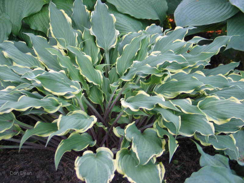 [M] This one has a wild side, and it doesn't bother trying to hide it! 'Kinky Boots' is a sport of 'Peek-a-boo Purple' from Don Dean with long, narrow blue-green leaves trimmed by relatively wide, heavily ruffled, creamy-yellow margins. The entire clump seems to shimmer with movement! Petioles are burgundy-purple and the plant looks attractive all summer. Hosta 'Kinky Boots' quickly forms a flared, flowing mound about 13" tall and 34" across that blooms with long purple scapes of fertile lavender flowers in mid summer.